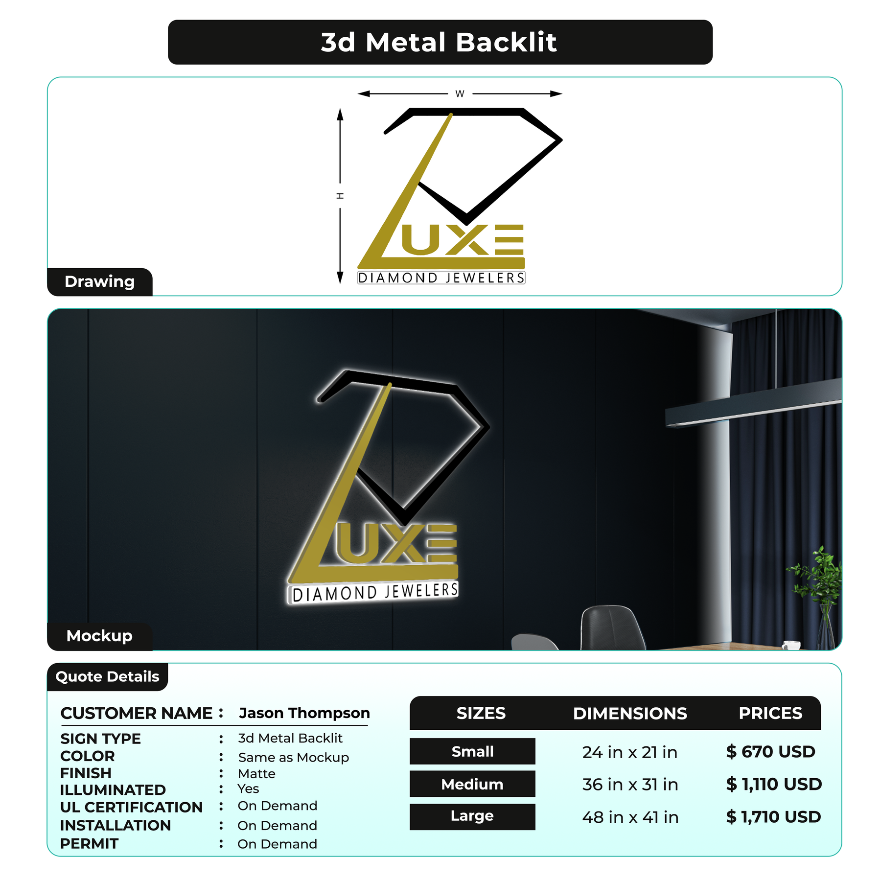 Durable and weather-resistant backlit sign made of aluminum or stainless steel.